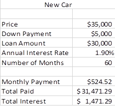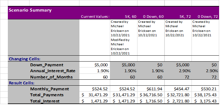 Microsoft Excel is an excellent planning tool for What-If Analysis, but did you know it has a Scenario Manager feature? Here’s a real life example: you are considering purchasing a new car and you are trying to decide how much of a down payment to provide. The dealer is offering different interest rates based on the length of the loan.