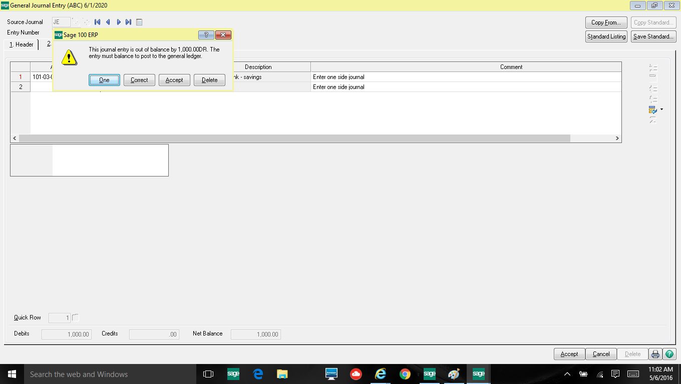 Then click Accept, a screen will pop up starting that the Sage 100 ERP Journal Entry is out of balance. Then next you will see that one of the buttons in “ONE”. Click on ONE and print the General Journal and post as usual.