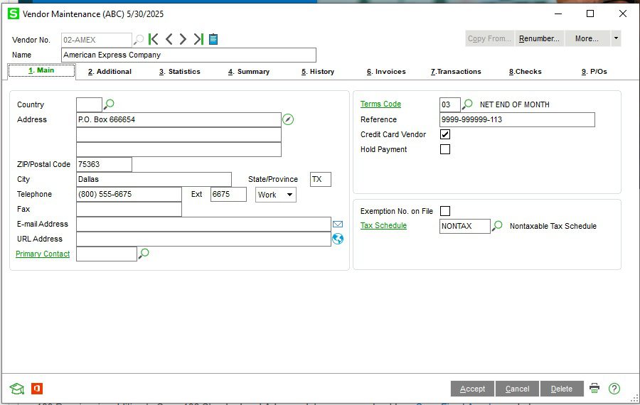 • First make sure your Credit Card vendor is set up, you do this by clicking the Credit Card Vendor check box. Accounts Payable>Main>Vendor Maintenance.